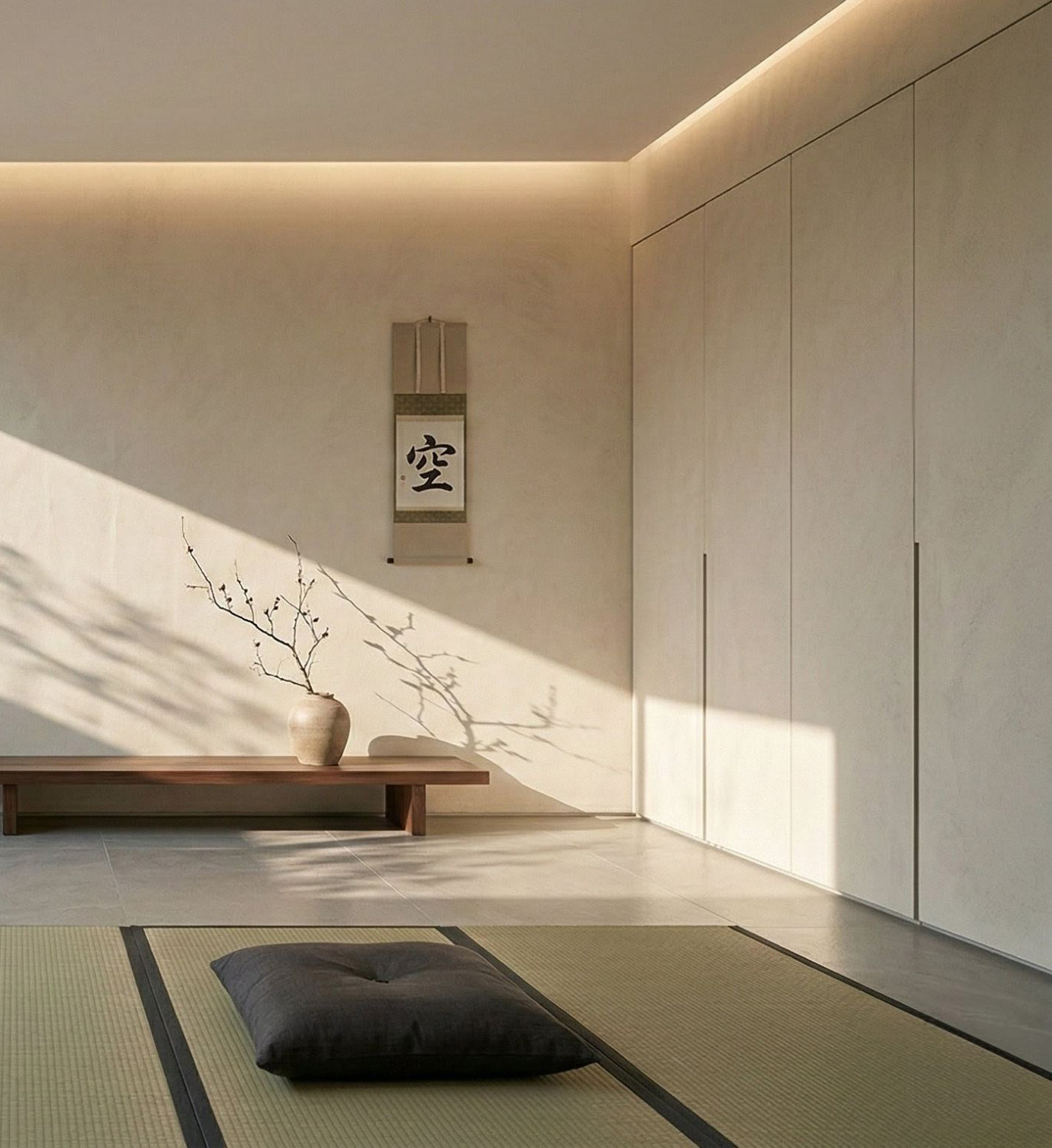 什麼是「空」 ? 禪風的核心哲學之一,就是打破對物質的過度佔有。在空間中,「空」不代表不存在,而是代表「無限的可能」。當我們捨棄了多餘的櫃體、華麗的裝飾與複雜的色彩,空間中的「氣」才能自由流動,光影才能在牆面上作畫。