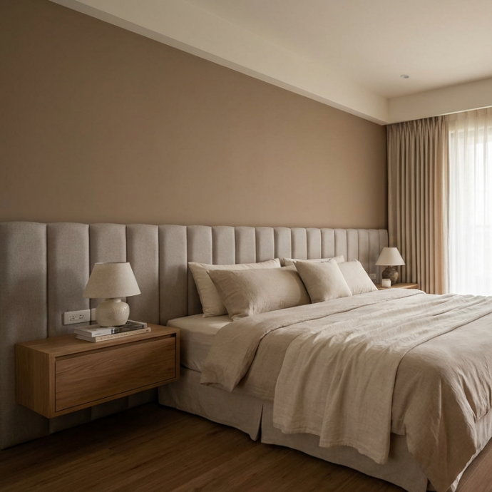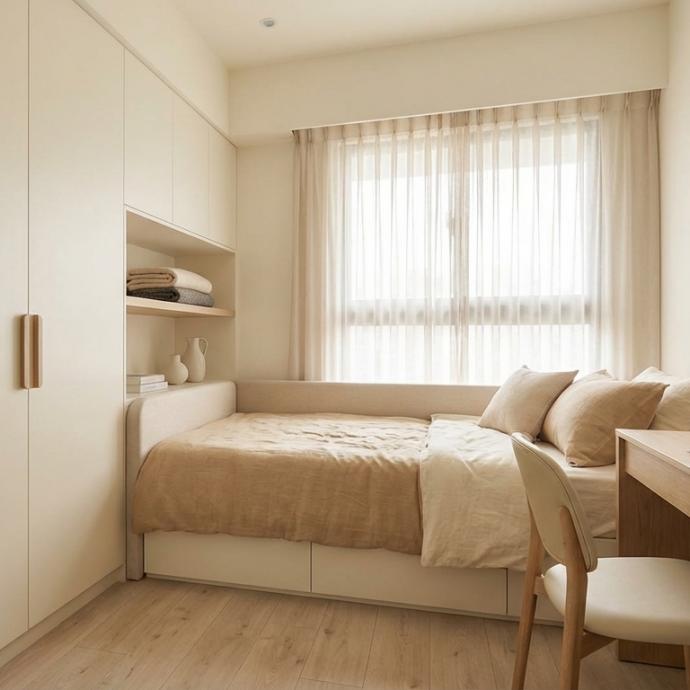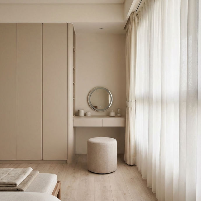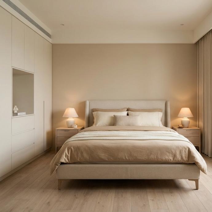 主臥室則以整面隱藏式衣櫃提升收納量,搭配木質梳妝桌與柔和燈光,營造沉靜療癒的休憩氛圍。整體設計在極簡與溫暖之間取得平衡,展現Japandi風格的自然與純粹。