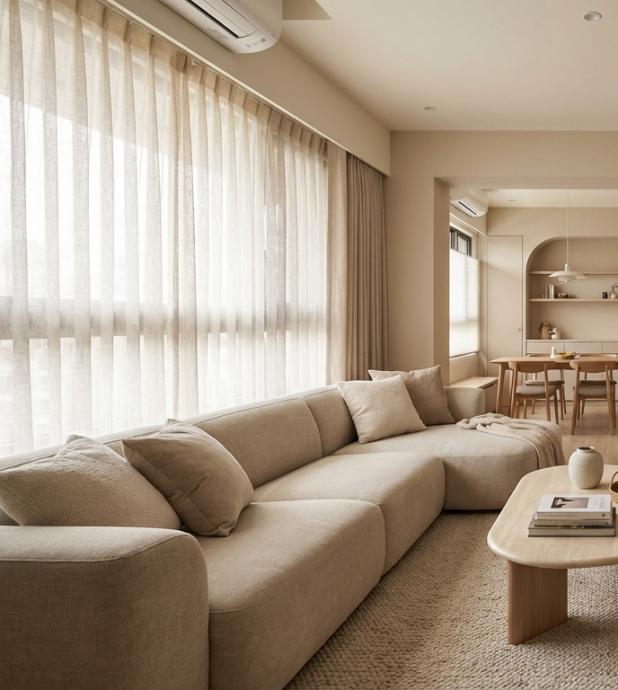 本案以「光・木・靜」為設計主軸,運用淺橡木色系統櫃貫穿客餐廳空間,打造溫潤且放鬆的生活氛圍。