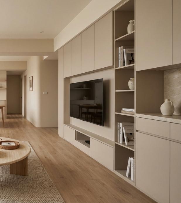 空間以侘寂風的低彩度色系為基底,搭配北歐風木質元素,創造沉靜又溫暖的居家氛圍。櫃體設計融入貓咪動線與收納需求,使寵物活動不影響生活整潔。